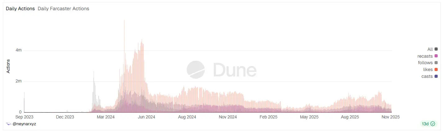 进入 2025 年,情况继续恶化,社交侧日活一度再降近 40%,直到 10 月推出 USDC 存款 10% 奖励活动,才依靠钱包功能把整体日活拉回到 5 万(UTC+8)至 6 万(UTC+8)区间。