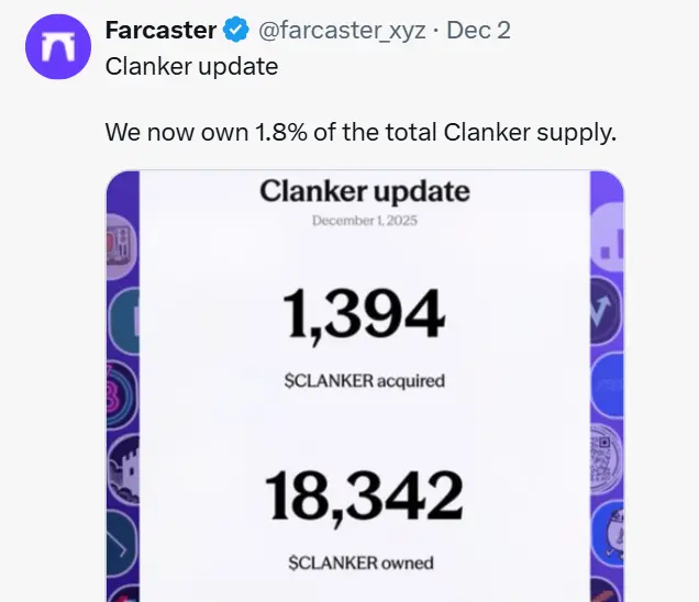 - 资产发行:通过收购代币发行平台 Clanker,Farcaster 为钱包核心战略配备了资产发行能力,现持有 Clanker 总供应量的 1.8%。