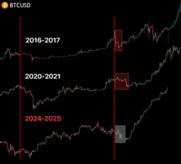 今年 8 月的 12.4 万美元新高、回调至 11 万美元,也与 2017、2021 年的末期走势极为相似。