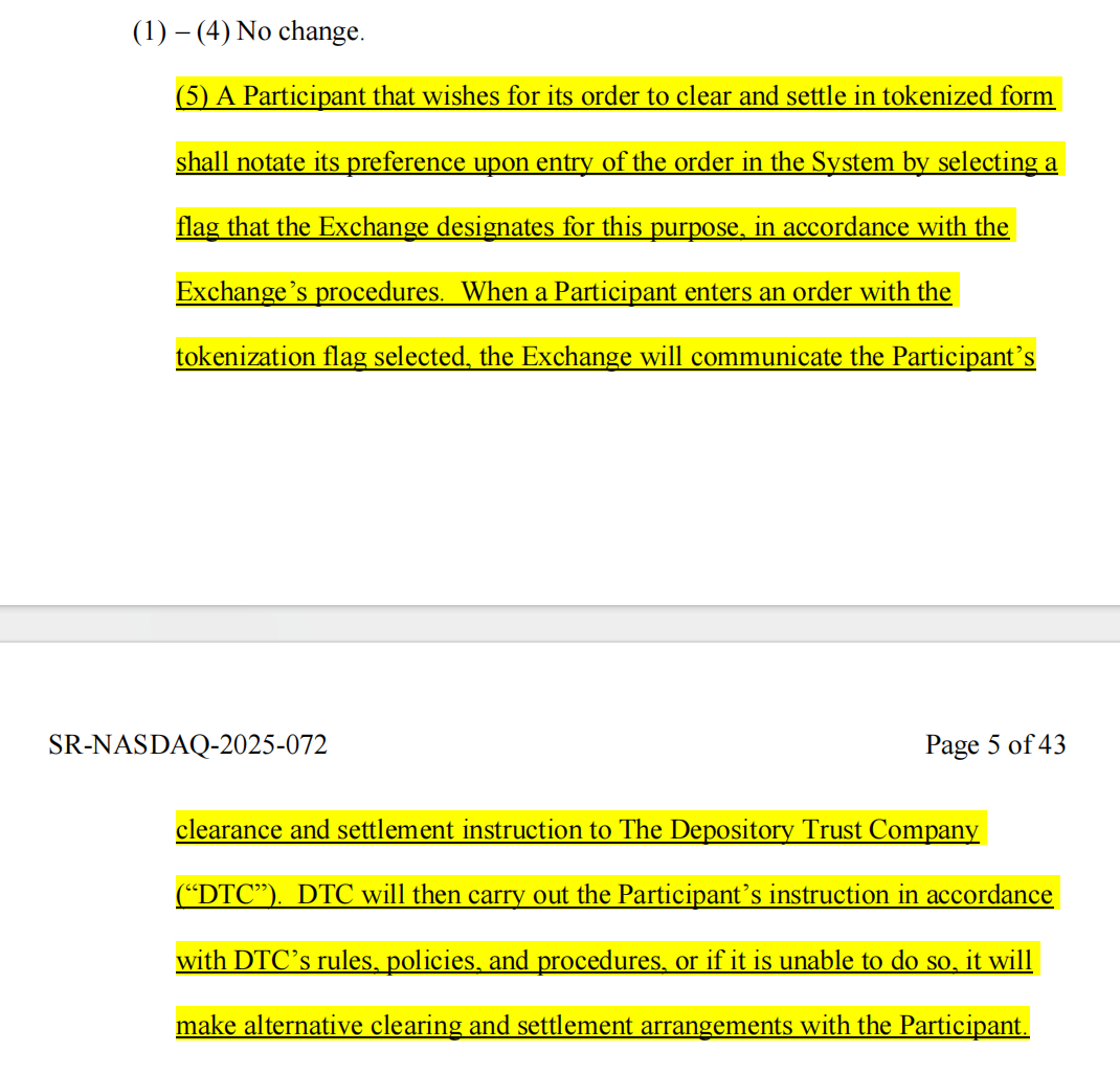 2025 年 9 月初,纳斯达克向 SEC 申请以代币化形式发行股票的新闻?在那份申请中,就已经出现了 DTC 的身影。