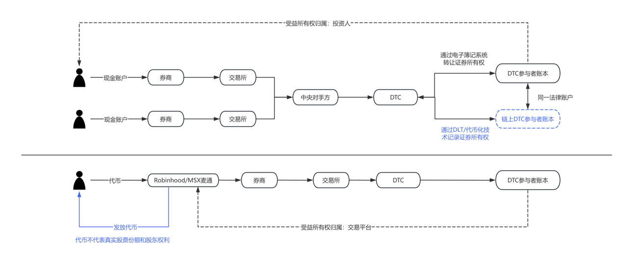 目前,美股的托管记账采用这样的运行模式:假设券商在 DTC 有账户,DTC 会用一套中心化系统记录买入、卖出的每一笔股票和份额。而这次 DTC 提出,我们能不能给券商提供一个选择,把这些股票持仓记录用区块链代币的方式再记录一遍?