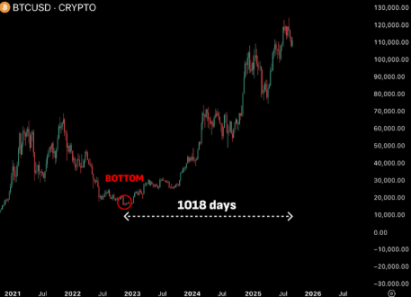 距离 2022 年 11 月的底部已过去 1020 天,而过往周期顶部通常出现在 1060–1100 天,换算意味着高点可能出现在 2025 年 10 月底至 11 月中;