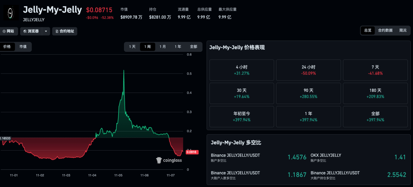 从 11 月 5 日见顶后到 11 月 7 日,价格一路回吐至 0.09 美元,整个时间仅仅三天,就走出一段直上直下的过山车行情。放量冲顶后 JELLYJELLY 成交量逐级走低,未平仓量(OI)从前高快速回落,配合价格下跌。简单说,就是薄深度里被资金直拉,高位承接不足后又直砸。